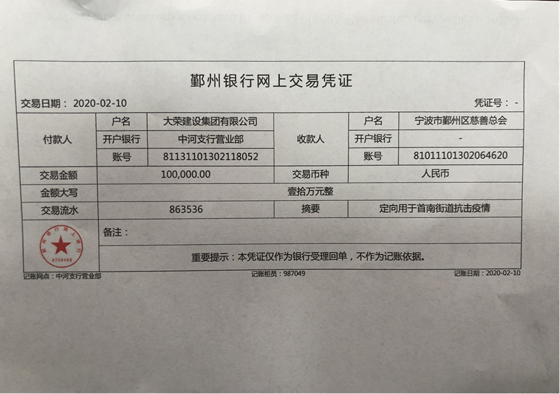 五是抗擊疫情,履行社會責(zé)任。積極響應(yīng)建筑業(yè)協(xié)會倡議向區(qū)慈善總會捐款壹拾萬元整及后續(xù)相關(guān)物資捐贈,定向用于抗擊疫情防控工作。組建抗擊疫情志愿者隊伍,支持地方防疫工作,為疫情防控扛起大榮人的責(zé)任擔(dān)當(dāng)。