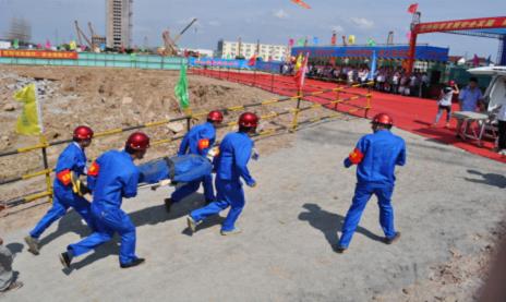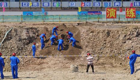 下午3時許,應(yīng)急救援演練正式開始。首先報警員向施工現(xiàn)場負責(zé)人報告。施工單位應(yīng)急救援領(lǐng)導(dǎo)小組接到事故報告后,立即發(fā)布啟動應(yīng)急救援預(yù)案的命令,并向公司領(lǐng)導(dǎo)和市建設(shè)工程安全監(jiān)督站報告。應(yīng)急救援各職能小組立即行動,按分工展開救援活動。疏散組立即對事故現(xiàn)場人員進行有組織的疏散;警戒組對事故現(xiàn)場進行封閉戒嚴;技術(shù)組對基坑邊坡進行穩(wěn)定性觀察及加固、對救援提出指導(dǎo)性技術(shù)意見;救援組隨即開展救援行動;醫(yī)療組及時對傷者進行救治;后勤保障組清除路障,引導(dǎo)120急救車趕赴事故現(xiàn)場進行施救。各應(yīng)急組協(xié)同作戰(zhàn)、快速反應(yīng)、科學(xué)施救。