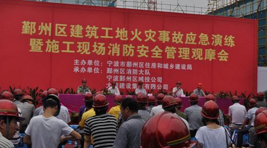 為確保“十八大”的順利召開,檢驗、評估我區(qū)建筑工程生產(chǎn)安全事故應(yīng)急救援預(yù)案的實用性、科學(xué)性,鍛煉應(yīng)急救援隊伍協(xié)調(diào)作戰(zhàn)的能力,提升企業(yè)自救和社會安全意識。6月26日上午,由鄞州區(qū)住建局主辦,鄞州區(qū)城投公司、鄞州區(qū)消防大隊及我公司共同承辦的應(yīng)急救援大型消防演練,在我公司所屬項目部鄞州區(qū)科技信息園區(qū)舉行。
