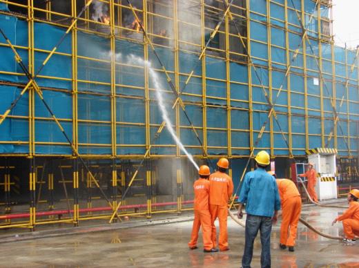 上午9時許,鄞州區(qū)住建局張瑞良局長宣布演練開始。鄞州區(qū)科技信息園建筑工地上,由于一名電焊工在建筑工地三層外腳手架從事電焊作業(yè)時,火星不慎濺射油漆桶內(nèi),造成外腳手架著火,火勢迅速蔓延,有一人被困。建筑工地負(fù)責(zé)人發(fā)現(xiàn)火情后,立即啟動了應(yīng)急救援預(yù)案,匯報公司領(lǐng)導(dǎo)及上級主管部門,并撥打119報警,同時組織人員對火場周圍進行警戒,確保疏散通道暢通,防止無關(guān)人員再次進入火災(zāi)現(xiàn)場,并利用滅火器及水槍水帶進行自救。