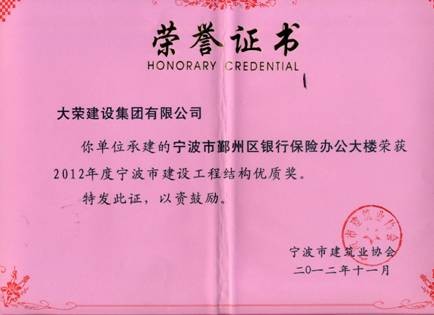 | 我公司承建的寧波市鄞州區(qū)銀行保險(xiǎn)辦公大樓工程榮獲“2012年度寧波市建筑工程結(jié)構(gòu)優(yōu)質(zhì)獎(jiǎng)”。 | |