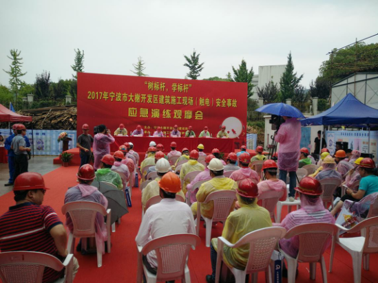 2017年6月28日上午, 寧波大榭開發(fā)規(guī)劃局在我公司承建的大榭醫(yī)院改擴(kuò)建工程項(xiàng)目部,舉行“樹標(biāo)桿、學(xué)標(biāo)桿”2017年寧波市大榭開發(fā)區(qū)建筑施工現(xiàn)場(chǎng)(觸電)安全施工應(yīng)急演練觀摩會(huì),社會(huì)保障局、安全環(huán)保局、應(yīng)急辦相關(guān)負(fù)責(zé)人和全區(qū)在建工程的建設(shè)、監(jiān)理、施工單位相關(guān)人員近60人參加演練觀摩。