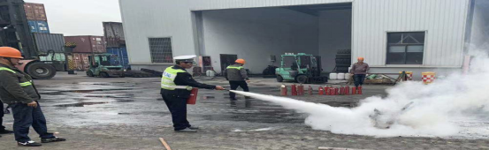 (圖345:?jiǎn)T工們正在規(guī)范地使用滅火器滅火)